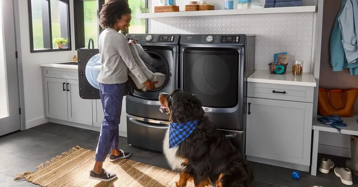 The Maytag® PetPro Front Load Laundry System is specifically designed to conquer pet hair, and is now available in front load and top load configurations. In the washer, the Pet Pro Option, which can be used on any wash cycle, unleashes additional water, a dedicated filter and a deep rinse to lift and remove pet hair. The Maytag® Pet Pro dryer traps and removes loads of pet hair from clothes in the lint trap with the Pet Pro option.