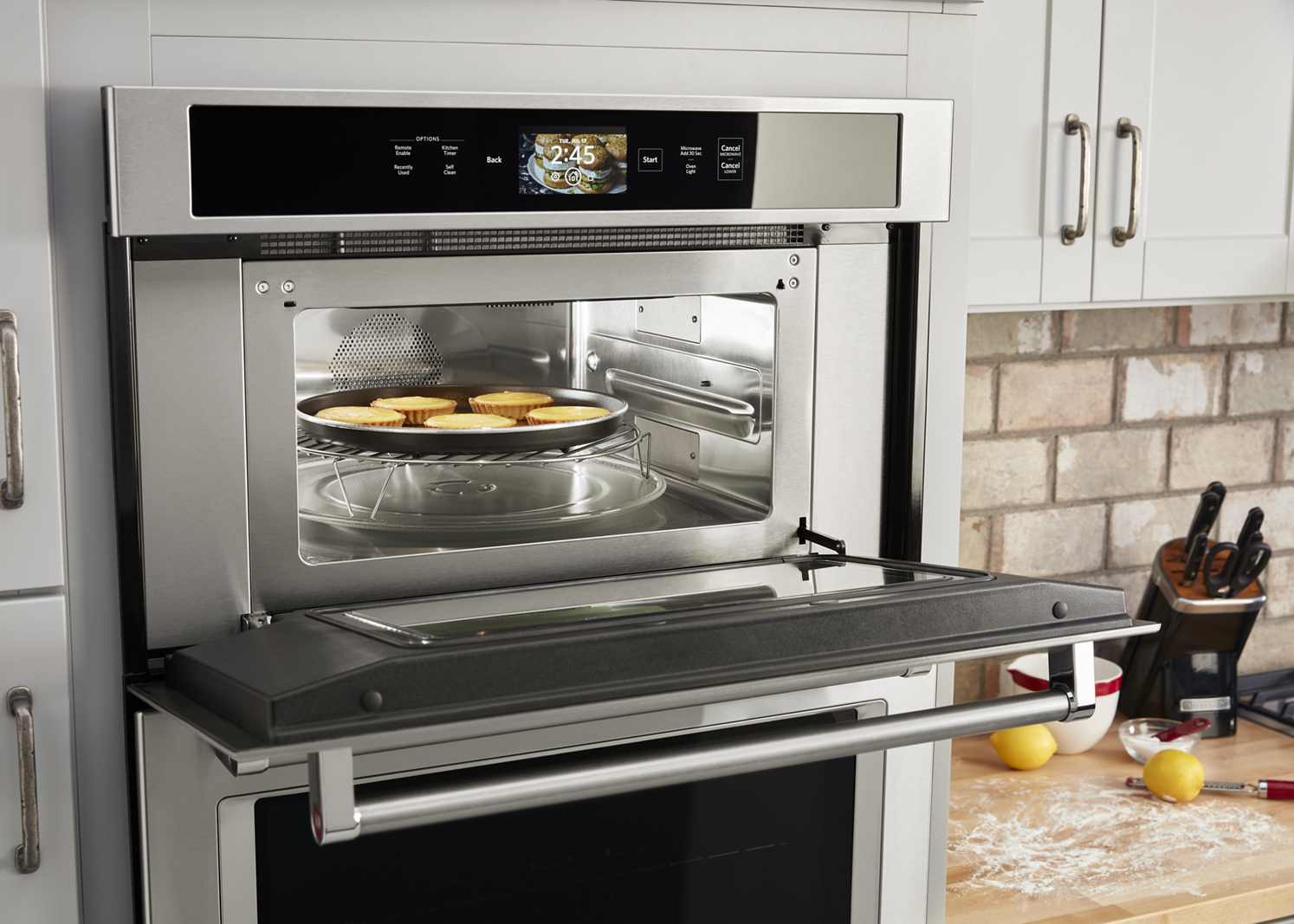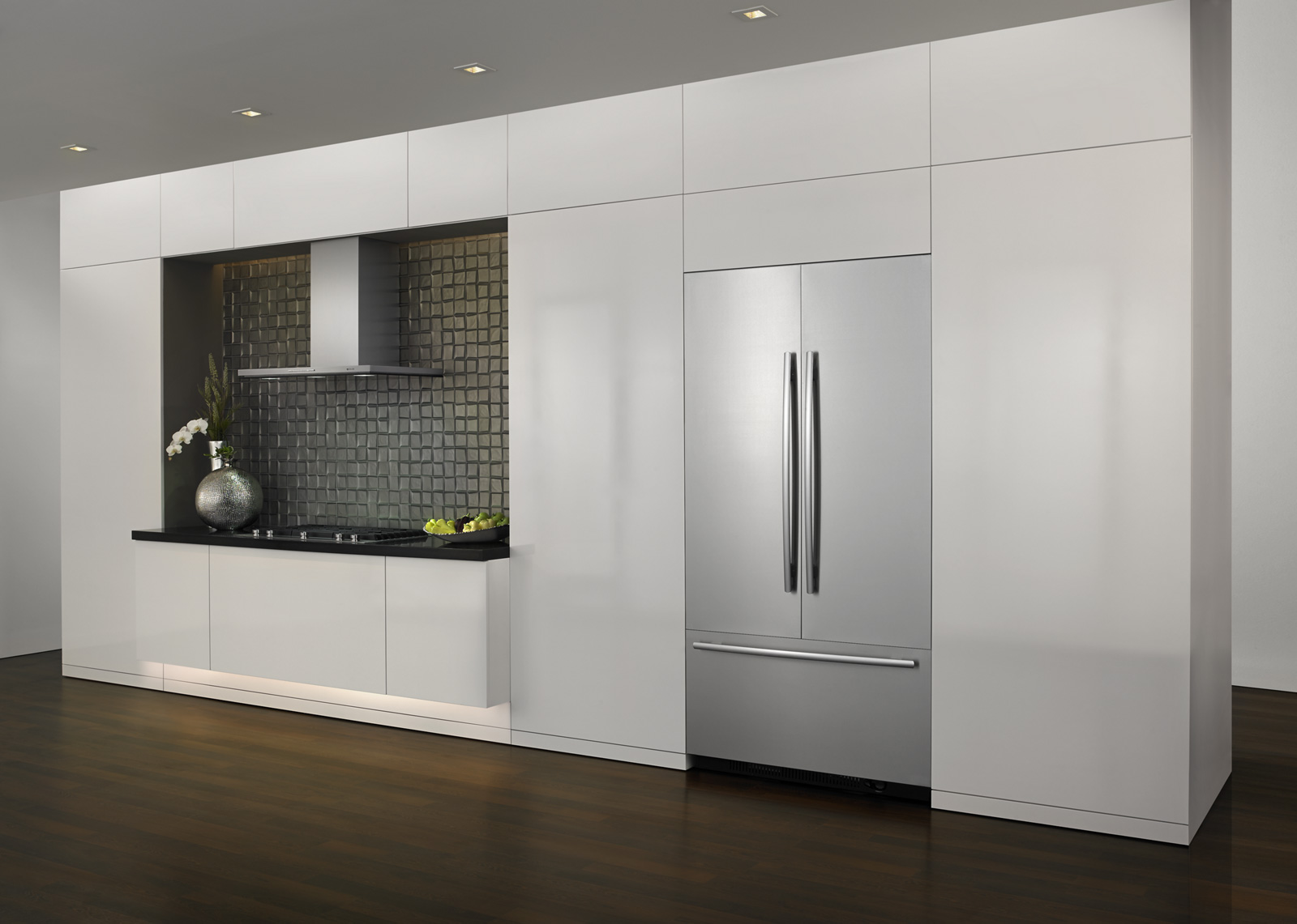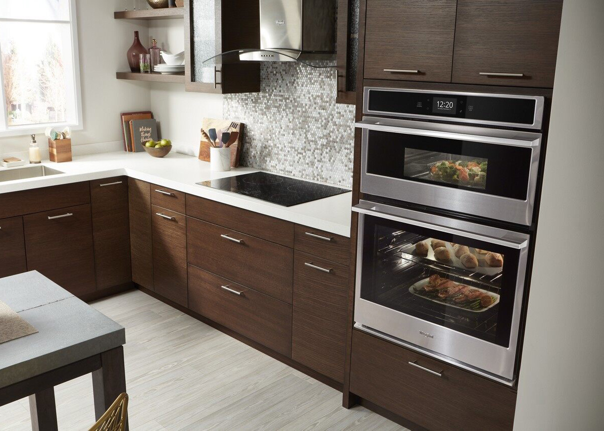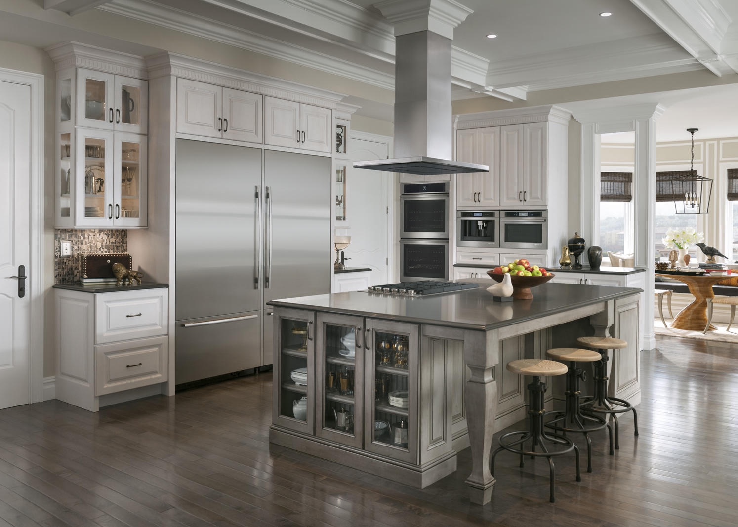 Break up the kitchen work triangle with multiple appliances. Rather than just one 30-inch wide refrigerator, consider seamlessly implementing several refrigerator doors into cabinets. For example, with a fully integrated, built-in refrigerator, you can create an integrated appearance with custom cabinetry without exposed hinges or trim pieces. In addition, instead of a separate oven and microwave, opt for a combination oven and microwave or even a double wall oven to help homeowners entertain a big crowd.