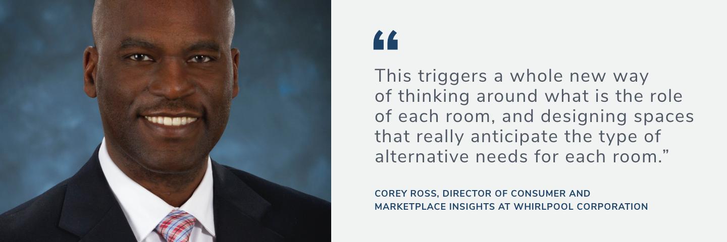 "Home builders will need to figure out ways to maximize that space, to serve multiple needs," said Corey Ross, Director of Consumer and Marketplace Insights at Whirlpool Corporation. "If people are working from home, they don't want to be working from a bedroom or kitchen. This triggers a whole new way of thinking around what is the role of each room, and designing spaces that really anticipate the type of alternative needs for each room."