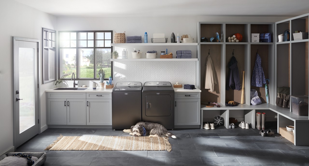 When designing this space, make sure to include lots of storage9, counter space10 for folding, and even space for a pet bed. A utility sink11 can also be helpful when tackling a tough stain or bathing furry friends. And don’t forget appliance innovations that provide high-quality laundry care, like the new Maytag® Pet Pro Top Load Washer, which takes pet maintenance to the next level. It was designed specifically with pet owners in mind, equipped with a filter that removes up to 5x more* pet hair. Not to mention, it also has a built-in faucet to help spot treat, rinse or soak clothes to tackle even the toughest stains.