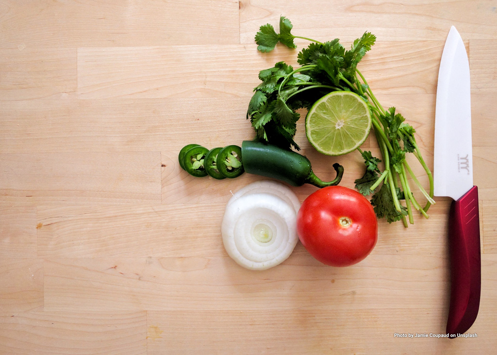 Include an area of wood butcher block on kitchen countertops where people can easily chop up fruits and vegetables. Butcher block is not only biodegradable, it brings a natural element into the kitchen. Its neutral tone makes it easy to incorporate with other kitchen design elements. Plus, butcher block is a softer material than other common countertop types such as stone or concrete, making for a quieter3, more peaceful space.