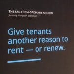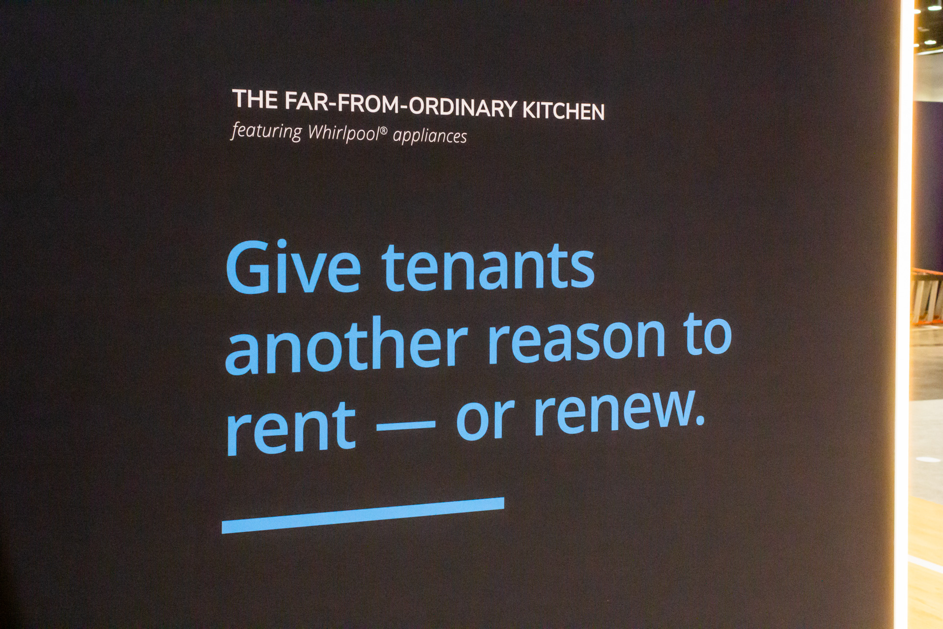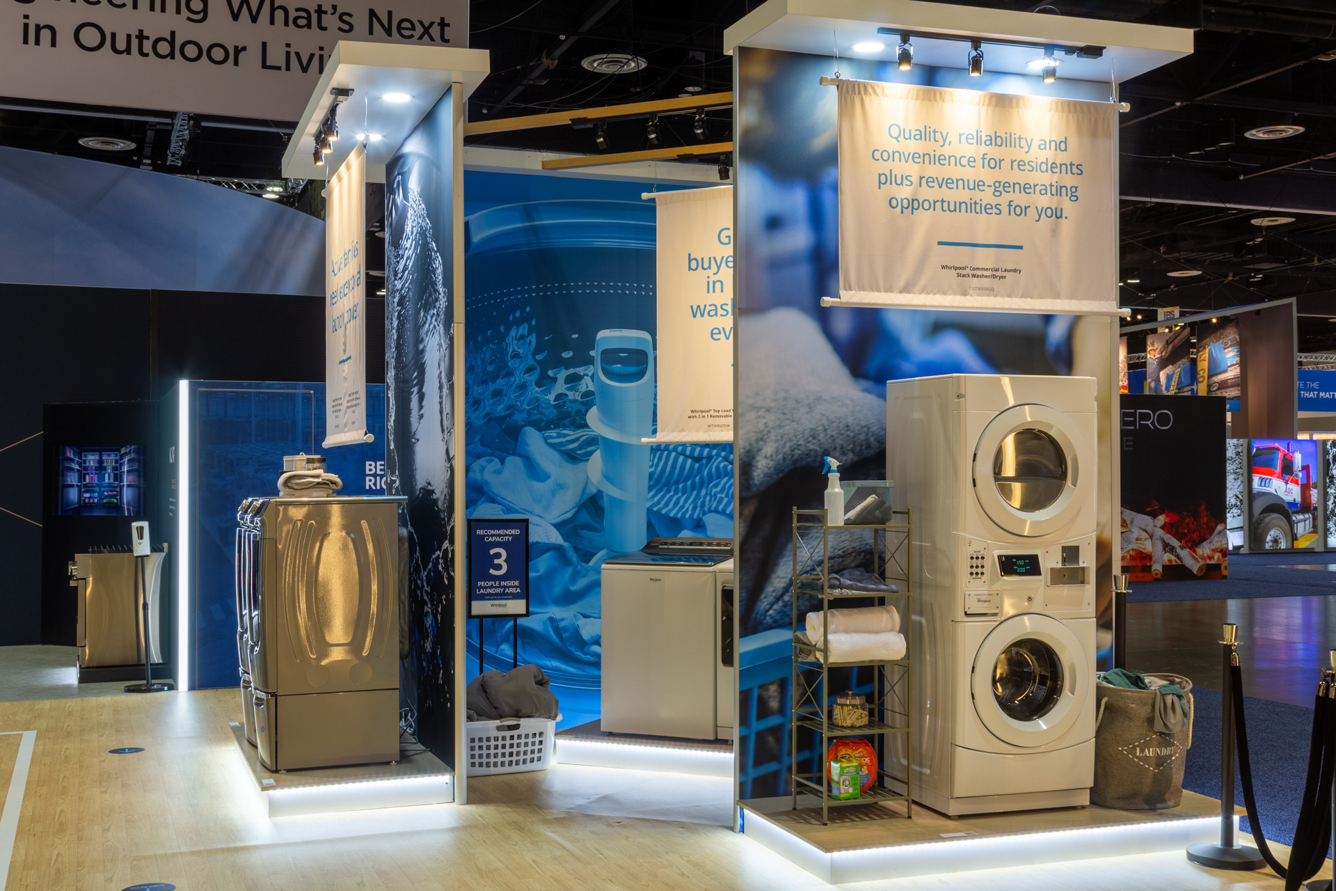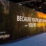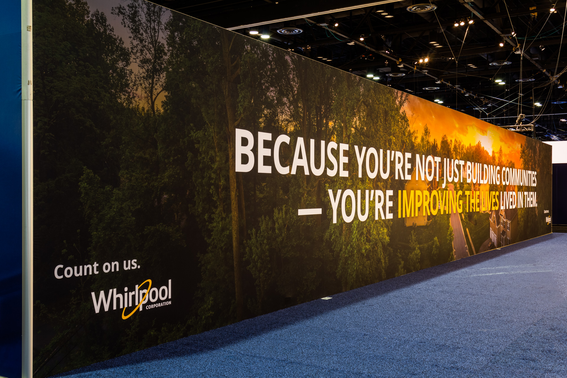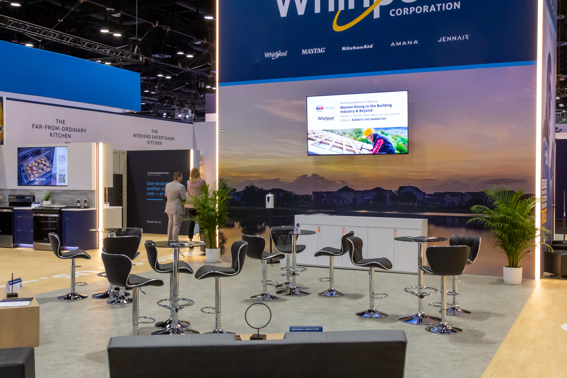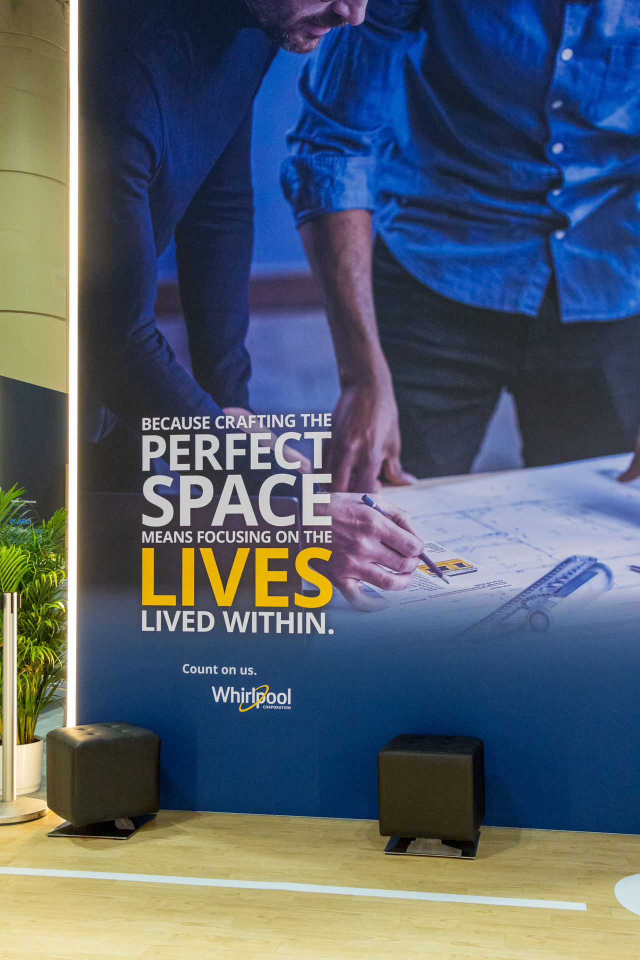 The booth featured large-print reasons to believe in Whirlpool Corporation’s comprehensive service offerings, alongside highly-saturated imagery that highlighted builders and designers in real work situations and the positive impact they have on the lives of their customers. Other notable details inside the booth answered the question “Why Whirlpool?” including: