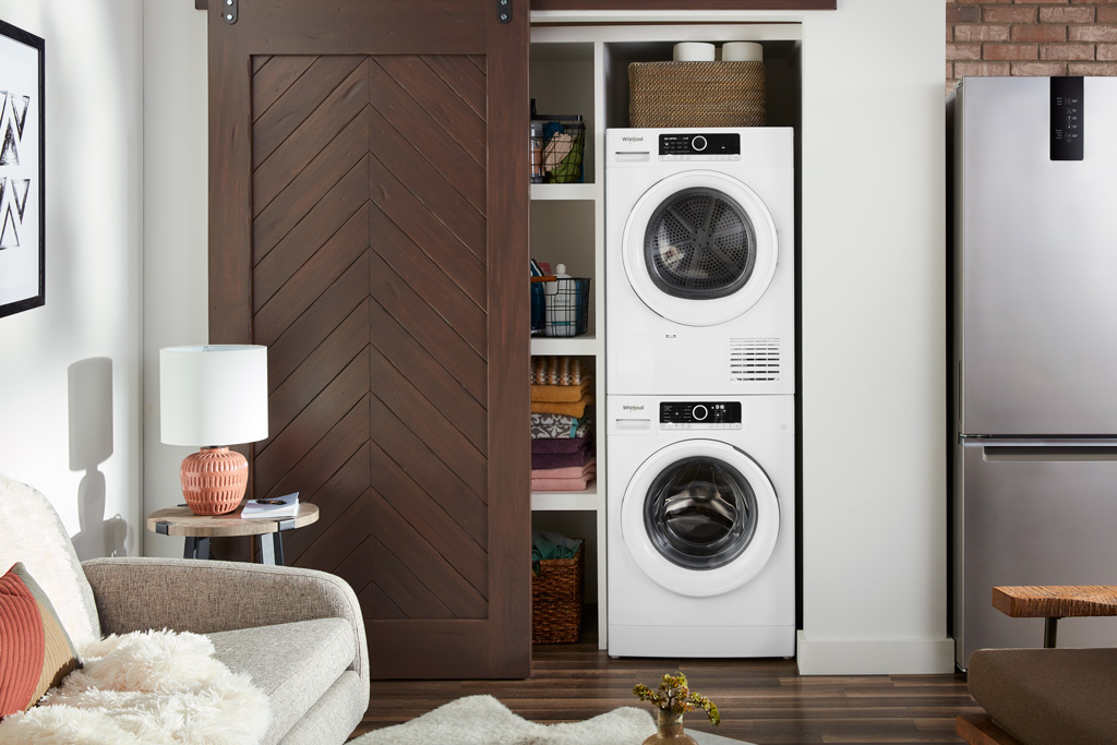 The Whirlpool® 1.9 cu. ft. 24” Compact Washer with Detergent Dosing Aid option is a great small space solution but doesn’t skimp on versatility: the Quick Wash cycle cleans small, lightly soiled loads and the Handwash cycle cleans clothes gently. Its matching pair, the Whirlpool® 4.3 Cu. Ft. 24” Small Space Ventless Dryer, is energy-efficient and has helpful features like the Wrinkle Shield™ Option that keeps wrinkles from forming in freshly dried clothes.