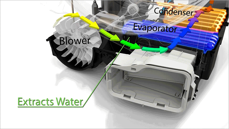 - Hot refrigerant returns energy (heat) to the processed air and recycles it back into the drum