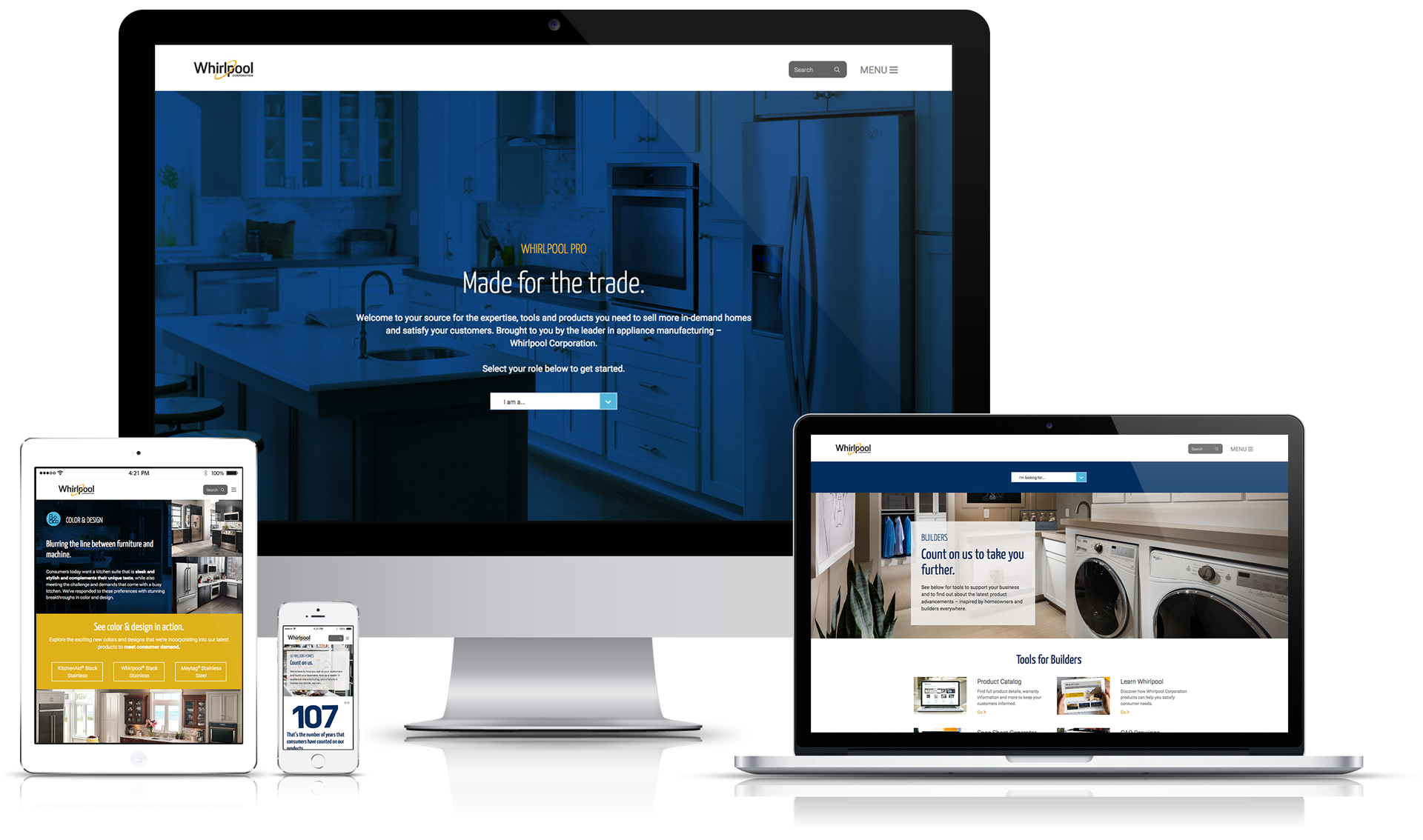 The new Whirlpool Pro website, launched in December 2017, was developed around trade audiences’ needs, and offers tailored content and resources for each major industry group. The site provides unique resources and tools specifically designed for builders, architects, designers, remodelers, distributors, retailers and sales.